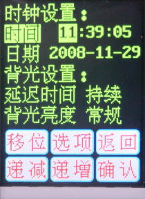 (1)時(shí)間設置——用于設置儀器內部的時(shí)鐘、日期、背光自動(dòng)關(guān)斷延遲時(shí)間,背光的亮度等。