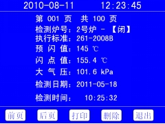 按“前頁(yè)”、“后頁(yè)”鍵順序查看記錄;按“打印”鍵將該記錄通過(guò)儀器的微型打印機打印出來(lái);按“刪除”鍵從儀器歷史記錄中刪除該條記錄;按“退出”鍵返回畫(huà)面6-1。