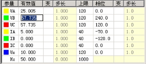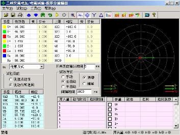 1. 需要注意的是,這里設置的幅值、變化步長(cháng)和相位都是序分量,是三相電壓或三相電流組合出的各序分量,而不是測試儀單相的實(shí)際輸出。任意改變界面上的序分量值(包括幅值和相位),軟件都能實(shí)時(shí)計算出相應的三相電壓、電流值,其數值在界面左下角的列表區中顯示,測試儀電壓電流輸出端子實(shí)際輸出的電壓電流值即為該量,而非序分量。