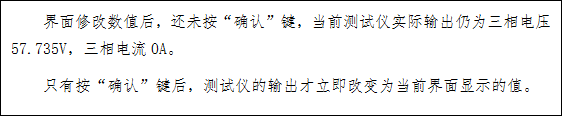 (3)在手動(dòng)方式時(shí),可以同時(shí)將各相輸出改變?yōu)樗枰闹怠>唧w操作方法是:依次直接鍵入所需改變的各相的幅值和相位值(在未完成前不按“確認”鍵),在各值均輸入完后按“確認”鍵,裝置將立即同步地將各相輸出改變?yōu)殒I入的各值。