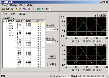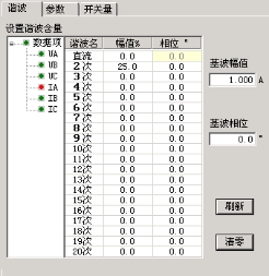 清零按鈕:它將當前窗口中顯示的各次波形(包括基波、直流,以及2~20次諧波)的幅值清零,相位回到其默認狀態(tài)。即A相的相位回到“ 0° ”,B相的相位回到“-120°”,C相的相位回到“120°”,該鍵僅對當前界面上顯示的參數有效。