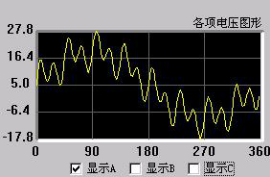 這里是對疊加后的波形顯示。可以選擇3相都顯示,也可以單獨顯示一相的波形。如圖中所顯示的就是A相電壓疊加后的了諧波以后的波形。這個(gè)圖形顯示很方便與示波器的圖形進(jìn)行對比。