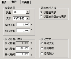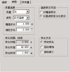 幅值步長(cháng):這里的步長(cháng)也與“諧波表示方法”相對應。當選擇“以幅值表示”時(shí),步長(cháng)也以幅值表示,單位是A或V;而選擇“以基波的百分比表示”時(shí),則步長(cháng)也是百分比。