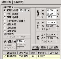 ???先設定“調電壓”,設待并側電壓V1為90V,不滿(mǎn)足同期條件。設待并側頻率F1和相位Φ1滿(mǎn)足同期條件(可設與系統側頻率很接近的49.9Hz、相位任意,也可設為頻率相等50Hz、相位相等0°),同時(shí)設置一定的“變電壓步長(cháng)”。點(diǎn)擊“添加”按鈕,將所設置的參數添加進(jìn)測試數據區中。開(kāi)始試驗后,手動(dòng)按步長(cháng)增▲(或減▼)鍵,改變電壓至同期裝置動(dòng)作。