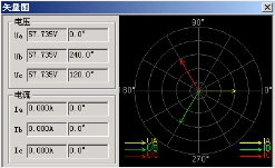 試驗期間點(diǎn)擊“矢量圖”按鈕,從打開(kāi)的矢量圖窗口中能觀(guān)察到電壓、電流矢量的幅值和相位的實(shí)時(shí)矢量圖。如右圖。