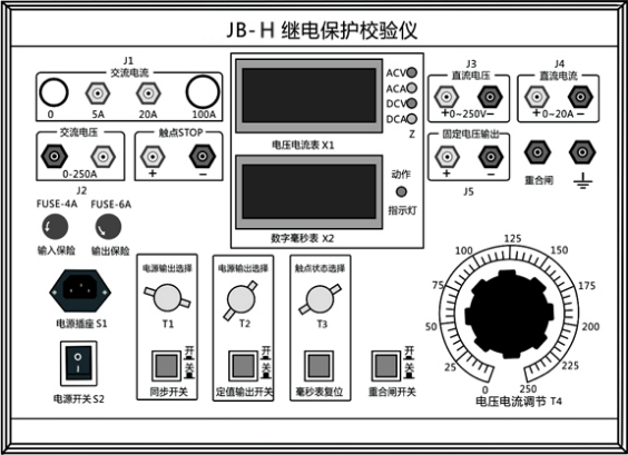 將T1調至AC5A(AC20A、AC100A),合上同步開(kāi)關(guān),調節T4,J1端輸出0~5A(0~20A、0~100A)交流電流,X1顯示當前電流值,電源輸出類(lèi)型ACA的指示燈亮。