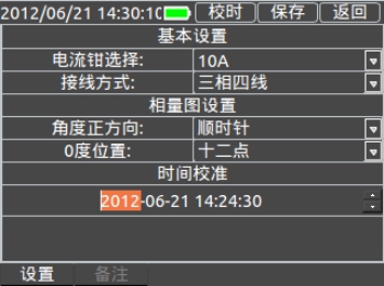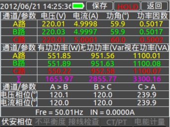 點(diǎn)擊【伏安相位】進(jìn)入基本伏安相位測量界面,分顏色顯示三相電壓、電流、功角、功率因數、相角和三相功率。