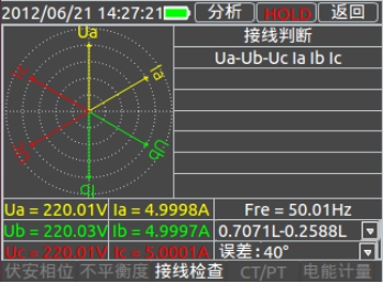 輕觸【接線(xiàn)檢查】進(jìn)入接線(xiàn)檢查界面,確定數據穩定點(diǎn)擊【HOLD】,保持現在數據不變,點(diǎn)擊【分析】系統可以分析現有接線(xiàn)是否錯誤,并提示正確連接方式。