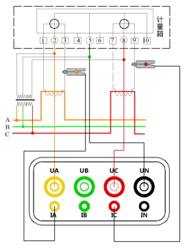 ????電壓線(xiàn)的連接:使用專(zhuān)用電壓測試線(xiàn)(黃、紅、黑三組),一端依次插入本儀器的UA、UC、UN相插孔,另一端分別接入被測線(xiàn)路的A相、C相、B相。注意:黃色線(xiàn)接UA插孔,黑色線(xiàn)接UN插孔、紅色線(xiàn)接UC插孔。