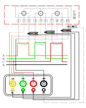 ????電壓線(xiàn)的連接:使用專(zhuān)用電壓測試線(xiàn)(黃、綠、紅、黑四組),一端依次插入本儀器的UA、UB、UC、UN相插孔中,另一端再接入被測線(xiàn)路的A相、B相、C相、零線(xiàn)。