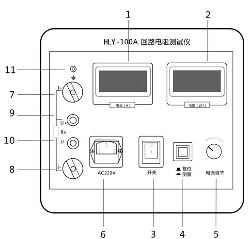 5.?調節“電流調節”旋鈕,使電流升至100.0A,按下“復位/測試”鍵,此時(shí)電阻表顯示值為所測的回路電阻值。若顯示1,則表示所測回路電阻值超量程;如果測量電流不是100.0A,例如為Io,電阻表顯示為Ro,則實(shí)際電阻值為R=100×(Ro÷Io)μΩ。