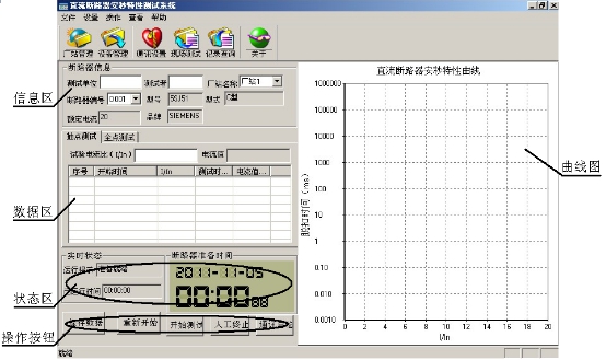 信息區:該區域主要顯示被測斷路器的基本參數,用戶(hù)需要填寫(xiě)測試單位和測試人姓名,在“廠(chǎng)站名稱(chēng)”和“斷路器編號”選項卡中可以選擇已存的所有不同廠(chǎng)家不同型號的斷路器。