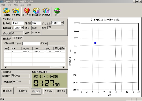 ???步驟2,點(diǎn)擊“開(kāi)始測試”按鈕,“開(kāi)始測試”按鈕變成灰色,狀態(tài)欄提示開(kāi)始測試,運行時(shí)間開(kāi)始計時(shí)。經(jīng)過(guò)一段時(shí)間后,被測試直流斷路器自動(dòng)斷開(kāi),表格上顯示序號1詳細測試結果,斷路器準備時(shí)間開(kāi)始倒計時(shí),曲線(xiàn)圖上顯示測試結果坐標點(diǎn)(如圖23);