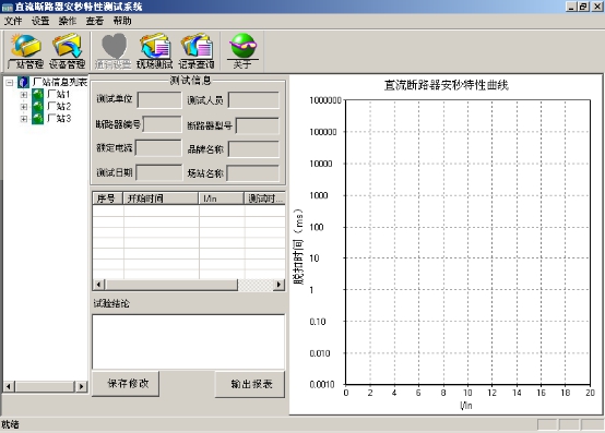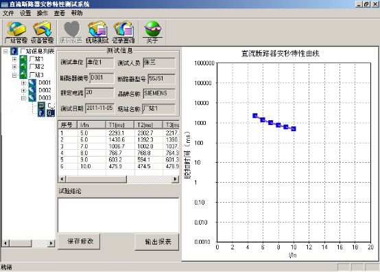 ???該界面左邊的工作區上的廠(chǎng)站信息列表里保存了已添加的所有廠(chǎng)家不同型號的直流斷路器的詳細的測試資料。點(diǎn)擊廠(chǎng)家前面的小+號可展開(kāi)廠(chǎng)家所有型號的直流斷路器的編號,雙擊選中編號可查看該編號下直流斷路器的詳細測試資料(如圖25所示),所有測試的參數信息加上安秒特性曲線(xiàn),界面簡(jiǎn)單直觀(guān),一目了然,用戶(hù)可隨意查看。在實(shí)驗結論區域,用戶(hù)可以對實(shí)驗結論加以說(shuō)明保存。點(diǎn)擊“輸出報表”可以將實(shí)驗結果生成word文檔加以保存。若儀器連接了打印機,執行菜單欄中的“文件”下級菜單中的打印即可打印測試結果。