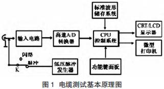 ? 在20 世紀90 年代的初期, 我國電力電纜故障的檢測儀在整個(gè)電路設計過(guò)程中主要是使用單片機的編程控制、CPU的處理器與高速A/D 的轉換器,且基本實(shí)現半自動(dòng)化的檢測。其中連線(xiàn)和基本原理從圖1 中可以看出。和第一代電力電纜故障的檢測儀比起來(lái), 該階段電力電纜故障的檢測儀對于信號處理的技術(shù)有了很大的進(jìn)步, 其充分使用了微處理器處理龐大數據的功能與各種先進(jìn)軟件。從某種意義上說(shuō),這種技術(shù)改變了傳統使用貯存的示波管來(lái)對瞬態(tài)模擬的波形進(jìn)行觀(guān)察的形式;以及通過(guò)人工讀取故障波形距的方法,都只是用微處理器可以自動(dòng)化跟蹤故障的波形變化, 并對故障的點(diǎn)距離進(jìn)行換算,以及自動(dòng)打印與自動(dòng)的數字顯示等。此外,還能按照各種類(lèi)型的電力電纜波傳輸的速度來(lái)自動(dòng)校正測試的距離,可見(jiàn)微處理器基本實(shí)現電力電纜故障的測試半智能化與半自動(dòng)化。