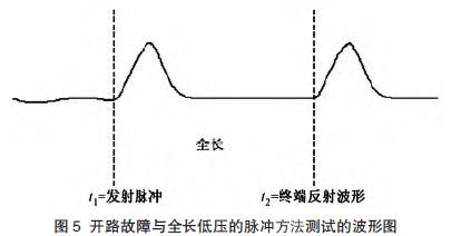 ? 目前低壓的脈沖法主要是按照微波的傳輸理念, 在電力電纜故障的相上加上脈沖的信號, 一旦電波傳送到故障的位置就會(huì )反射會(huì )部分電波, 然后仔細分析反射波和入射波之間時(shí)間的差值,精確計算故障點(diǎn)距離。因為輸出信號電力比較低且安全,所以經(jīng)常將這種測試方式叫做低壓的脈沖法,這種方式能夠用來(lái)測試電纜長(cháng)度、低阻故障與開(kāi)路故障等,具體波形的規律從圖5 中可以看出。