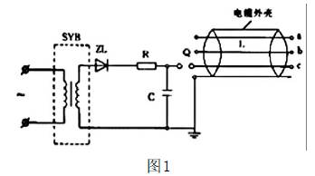 所謂測聲法就是根據故障電纜放電的聲音進(jìn)行查找,該方法對于高壓電纜芯線(xiàn)對絕緣層閃絡(luò )放電較為有效。此方法所用設備為直流耐壓試驗機。電路接線(xiàn)如圖1 所示,其中SYB 為高壓試驗變壓器,C 為高壓電容器,ZL 為高壓整流硅堆,R 為限流電阻,Q 為放電球間隙,L 為電纜芯線(xiàn)。