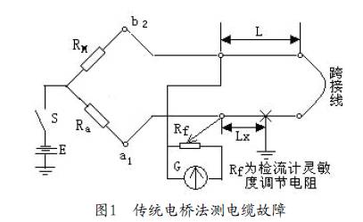 3.1.1 電橋法:電橋法是最常用的測試電纜故障的方法,電力電纜的高阻故障差不多占了故障的90%,可以用高壓電橋法和低壓電橋法進(jìn)行測量。它指的是被測電纜終端故障相與非故障相短接時(shí),電橋兩臂分別接故障相與非故障相,通過(guò)電橋平衡,就可計算出電纜故障點(diǎn)到測量端及末端的距離。電橋法測電纜故障如圖1所示:
