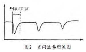 3.1.3 脈沖電壓法:脈沖電壓法包括直閃法(直閃法的波形圖見(jiàn)圖2)和沖閃法。具體指的是,在高壓脈沖信號下將電纜故障擊穿,然后記錄放電脈沖在測量點(diǎn)與故障點(diǎn)來(lái)回所需的時(shí)間,再進(jìn)行測距。