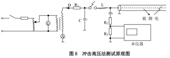? (4)直閃法的測試原理。在實(shí)際測試時(shí)利用高壓設備和本公司高壓測試裝置,按圖 8 所示線(xiàn)路連接。