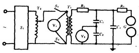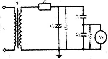 分壓器-電壓表測量系統:可分為電容分壓器-電壓表測量系統(圖1-22中C1、C2、V2)、電阻分壓器-電壓表測量系統和電阻分壓器-電壓表測量系統。?