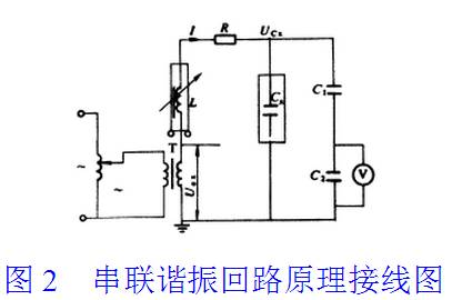 ? 對SF6組合電器(GIS),發(fā)電機和變壓器等電容量較大的被試品進(jìn)行交流耐壓試驗,需要大容量的試驗設備,可采用串聯(lián)諧振試驗裝置,它能夠以較小的電源容量試驗較大電容和較高試驗電壓的試品,回路由被試品負載電容和與之串聯(lián)的電抗器和電源組成,如圖2所示。