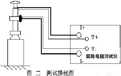 ? 1. 儀器接線(xiàn):如圖二所示,將專(zhuān)用測試線(xiàn)按照顏色紅對紅,黑對黑,粗的電流線(xiàn)接到對應的I+、I-接線(xiàn)柱扭緊,細的電源線(xiàn)插入到V+、V-的插座內,兩把夾鉗夾住被測試品的兩端。