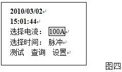 ? 3. 選擇電流為固定值100A,按確認鍵進(jìn)行時(shí)間選擇,其中選擇時(shí)間包括:脈沖、30秒、1分鐘、5分鐘、10分鐘、連續。選擇好時(shí)間后按確認鍵進(jìn)行測試—查詢(xún)—設置詢(xún)環(huán)選擇,如果要進(jìn)行測試,可直接按確認鍵進(jìn)行測試。