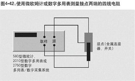 ? 圖4-42說(shuō)明用來(lái)測試一個(gè)接點(diǎn)的接觸電阻的基本配置。使用具有四端測量能力的歐姆計,以避免在測量結果中計入引線(xiàn)電阻。將電流源的端子接到該接點(diǎn)對的兩端。取樣(Sense)端子則要連到距離該接點(diǎn)兩端電壓降最近的地方。其目的是避免在測量結果中計入測試引線(xiàn)和體積電阻(bulk?resistance)產(chǎn)生的電壓降。體積電阻就是假定該接點(diǎn)為一塊具有相同幾何尺寸的金屬實(shí)體,而使其實(shí)際接觸區域的電阻為零時(shí),整個(gè)接點(diǎn)所具有的電阻,設計成只有兩條引線(xiàn)的器件有的時(shí)候很難進(jìn)行四線(xiàn)連接。器件的形式?jīng)Q定如何對其進(jìn)行連接。一般,應當盡可能按照其正常使用的狀態(tài)來(lái)進(jìn)行測試。在樣品上放置電壓探頭時(shí)不應當使其對樣品的機械連接產(chǎn)生影響。例如,焊接探頭可能會(huì )使接點(diǎn)發(fā)生不希望的變化。然而,在某些情況下,焊接可能是不可避免的。被測接點(diǎn)上的每個(gè)連接點(diǎn)都可能產(chǎn)生熱電動(dòng)勢。然而,這種熱電動(dòng)勢可以用電流反向或偏置補償的方法來(lái)補償。