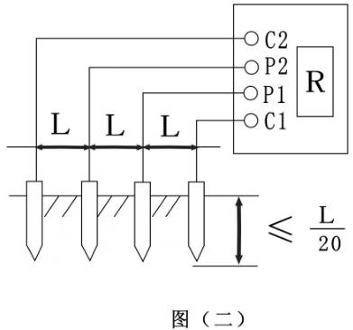 1) 測量時(shí)在被測的土壤中沿直線(xiàn)插入四根探針,并使各探針間距相等,各間距的距離為 L,要求探針入地深度為 L/20cm,用導線(xiàn)分別從 C1、P1、P2、C2各端子與四根探針相連接。若地阻儀測出電阻值為 R,則土壤電阻率按下式計算: