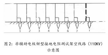但是鉗型接地電阻測試儀也具有一定的缺陷,即儀器的使用范圍受到限制,在很多情況下都不能正常使用。下圖為非輔助電極鉗型接地電阻測試架空線(xiàn)路(110KV)示意圖2。針對大型建筑物中的常用電氣設備來(lái)講,如果采用輔助電極的測試方法來(lái)對 110KV 以上的避雷塔桿接地環(huán)網(wǎng)接地電阻進(jìn)行測試,其各個(gè)接地點(diǎn)必須要保證是斷開(kāi)的狀態(tài),這種方法在工作中并不現實(shí),因此采用非輔助電極鉗型接地電阻測試法來(lái)進(jìn)行測試。圖中 1 到 i 表示有共有 i 個(gè)鐵塔,在 1 的地方進(jìn)行接地電阻的測試之時(shí),一定要保持該處的接地體是斷開(kāi)的狀態(tài),否則其測量的結果就是無(wú)效的。采用非輔助電極鉗型接地電阻測試儀來(lái)對 110KV 架空線(xiàn)路鐵塔接線(xiàn)進(jìn)行測試,如在 1 處的測試,只要將卡鉗卡入 1 點(diǎn)接地線(xiàn),就能夠通過(guò)儀器測得所需要測的 1 處的數據。實(shí)際上,非輔助電極鉗型接地電阻測試儀是測量的一種閉環(huán)導體的回路電阻,雖然這種測量方法在一定情況下具有其自身的優(yōu)點(diǎn),但是這種方法并不適用于非閉環(huán)系統或者獨立的系統,因此具有使用范圍上的限制。