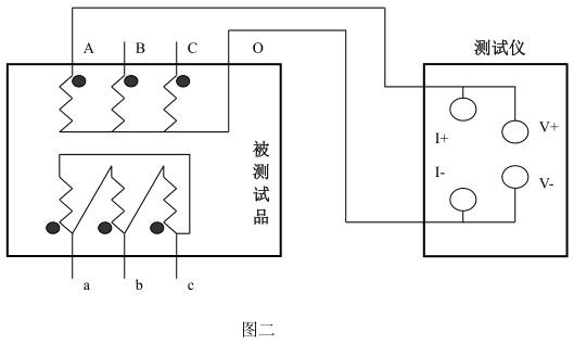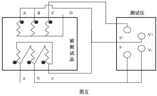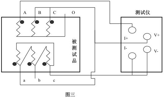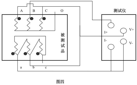 ? 對于大容量的變壓器的低壓側測量時(shí),如果在既有的情況下,直流電阻測試儀的最大電流比較小,或者為了加快測量速度,可選擇助磁法測量。下圖中,圖三、圖四、圖五分別為測量低壓 Rac、Rba、Rcb 的接線(xiàn)方法。