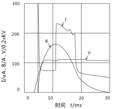 整機由測量控制電路、電場(chǎng)高壓產(chǎn)生電路、磁場(chǎng)線(xiàn)圈電流控制電路、通訊、打印機、液晶顯示電路等組成。其工作過(guò)程為:由測量控制電路發(fā)出指令,由開(kāi)關(guān)電源給磁場(chǎng)電容充電,通過(guò)控制電路監控,當磁場(chǎng)電容上的電壓達到預定值后,控制電路發(fā)出兩路控制信號分別控制電場(chǎng)高壓的輸出和磁場(chǎng)線(xiàn)圈電流的導通,使滅弧室處于強電場(chǎng)、強磁場(chǎng)的狀態(tài)中,滅弧室開(kāi)始放電,產(chǎn)生離子電流I,如圖2中的曲線(xiàn)I所示。該電流經(jīng)取樣電阻R和預處理電路后輸入單片機,最后經(jīng)運算由液晶顯示屏顯示測得的真空度值。