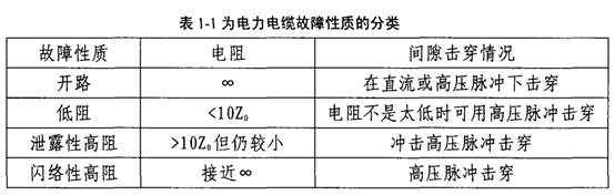 ? 電纜故障從形式上可分為串聯(lián)與并聯(lián)故障。串聯(lián)故障是指電纜一個(gè)或多個(gè)導體包括鉛、鋁外皮斷開(kāi)。通常在電纜至少一個(gè)導體斷路之前,串聯(lián)故障是不容易發(fā)現的。并聯(lián)故障是指導體對外皮或導體之間的絕緣下降,不能承受正常運行電壓。實(shí)際的故障組合形式是很多的,幾種可能性較大的故障形式是一相對地、兩相對地和一相斷線(xiàn)并接地。定義電纜故障為無(wú)損壞故障一、開(kāi)路故障一、短路故障。而文獻等將電纜故障分為開(kāi)路故障、低阻故障和高阻故障三種類(lèi)型,如表一所示。下面對這一分類(lèi)法作以簡(jiǎn)單介紹