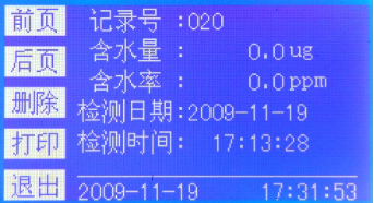 打印:打印當前的歷史記錄,打印內容包括:樣品編號、含水量、含水率、檢測日期、檢測時(shí)間。