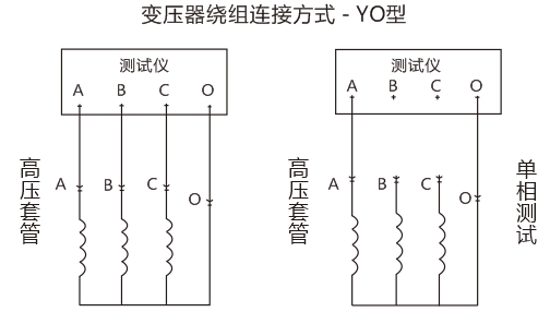 3. 對于中間調壓的有載開(kāi)關(guān)U、V、W 三相的1、2、3、4。分別連接在一起。U、V、W 三相的另外一端都連接在一起作中性點(diǎn)。儀器的 A、B、C、O分別對應的接在U、V、W上和作的中性點(diǎn)上。接線(xiàn)方式YO測試方法和帶繞組測試一樣。