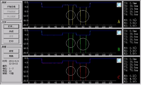 此圖為變壓器有載開(kāi)關(guān)有斷點(diǎn)的波形,白顏色的圓圈是提醒用戶(hù)注意。