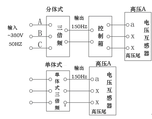 2.將試驗所需的SFQ三倍頻、SFQ操作箱(操作臺)、互感器按示意圖所示的方法連接好;仔細檢查,確保輸入、輸出、儀表接地線(xiàn)準確無(wú)誤后,方可通電進(jìn)行操作。此時(shí)三倍頻的次級輸出即為150Hz的三倍頻電源。