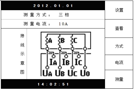 “方式”鍵:設置測量方式,包括“單相”、“兩相”和“三相”。并且在“接線(xiàn)示意圖”的區域會(huì )顯示相應的接線(xiàn)圖,可作為實(shí)際接線(xiàn)時(shí)的參考。