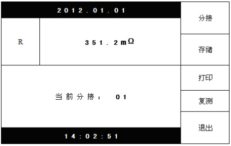 現在,直阻儀開(kāi)始顯示被測繞組的電阻值,并逐步趨于穩定。此時(shí)可以按“分接”鍵調整和設置當前分接值或繞組名,以便對測量結果進(jìn)行標注。按下“分接”鍵后,右側的多功能鍵變成“▲”“▼”“