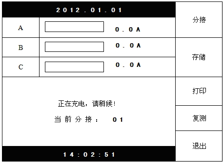 選擇好測量電流,接好三相接線(xiàn),在初始界面狀態(tài)下按“測量”鍵后,直阻儀進(jìn)入測量狀態(tài),開(kāi)始給繞組供電。并進(jìn)入如下界面: