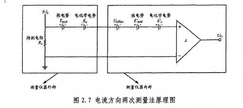 電流反向兩次測量法的原理如下圖2.7所示,誤差源中的熱電動(dòng)勢既來(lái)自測量電路外部,又來(lái)自測量電路本身;電化學(xué)電勢,同樣也來(lái)自測量電路外部和內部,折算到放大電路輸入端放大電路本身的失調電壓,記為際。這些誤差信號大小基本都不隨測試電流的大小和方向變化,但是熱電動(dòng)勢會(huì )隨溫度變化而變化