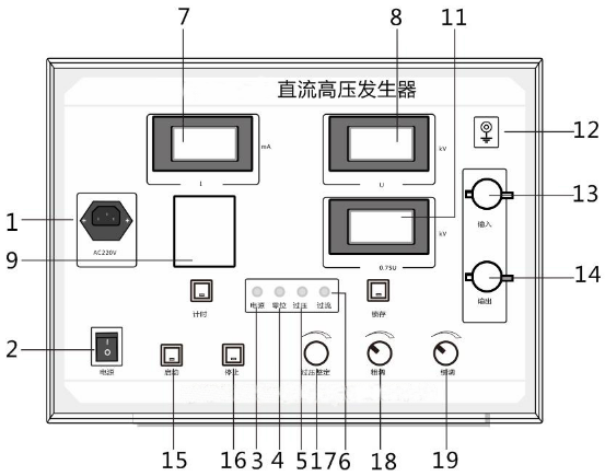 ZGS系列直流高壓發(fā)生器由控制箱和倍壓裝置兩部分組成,其控制面板布置如圖2所示。