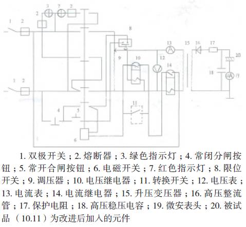6)如果是做故障點(diǎn)擊穿試驗時(shí),將電壓繼電器拔出,轉換開(kāi)關(guān)打在連接位置,試驗設備恢復到未改進(jìn)時(shí)的狀態(tài),輸出電壓將不在受電壓繼電器的控制,只有當發(fā)生閃絡(luò )或被擊穿被試品,回路的電流增大,使得電流繼電器動(dòng)作,同樣斷開(kāi)電磁開(kāi)關(guān)電源,使輸出為零,保護了試驗設備。
