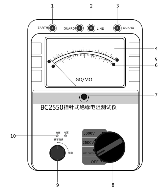 (2)額定的輸出電壓保持在對BC2550指針式絕緣電阻測試儀負載電阻可低至4MΩ/8MΩ/20MΩ;對20MΩ/40MΩ。