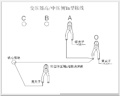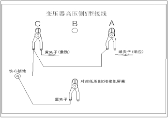 ◇地線(xiàn)連接網(wǎng)依次由綠夾子地線(xiàn)孔插入接地線(xiàn)至黃夾子地線(xiàn)孔,再由一根地線(xiàn)轉接到鐵芯接地。將黑夾子連接至鐵芯接地,鉗在低壓側C相上。