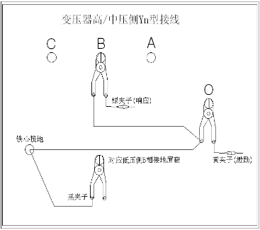 ◇地線(xiàn)連接網(wǎng)依次由綠夾子地線(xiàn)孔插入接地線(xiàn)至黃夾子地線(xiàn)孔,再由一根地線(xiàn)轉接到鐵芯接地。將黑夾子連接至鐵芯接地,鉗在低壓側B相上。