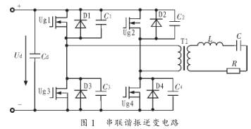 典型的串聯(lián)諧振逆變電路如圖 1 所示。 圖中 D 1 、 D 2 、 D 3 、D 4 功率開(kāi)關(guān)器件 Ug1 、 Ug2 、 Ug3 、 Ug4 的反并聯(lián)快恢復二極管, C 1 、 C 2 、 C 3 、 C 4 為開(kāi)關(guān)器件的吸收電容 (包括開(kāi)關(guān)器件的結電容), C d 為直流濾波電容, L 、 C 、 R 為等效串聯(lián)諧振負載。