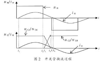 在零電壓換流模式下,逆變器的工作頻率略高于諧振負載的固有諧振頻率,即負載電流 i H 滯后于負載電壓 u H ,負載電壓 u H 和負載電流 i H 簡(jiǎn)圖如圖 2 所示。