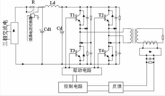 串聯(lián)諧振逆變器也稱(chēng)電壓型逆變器,其原理圖如圖2.2所示。串聯(lián)諧振型逆變器的輸出電壓為近似方波,由于電路工作在諧振頻率附近,使振蕩電路對于基波具有最小阻抗,所以負載電流